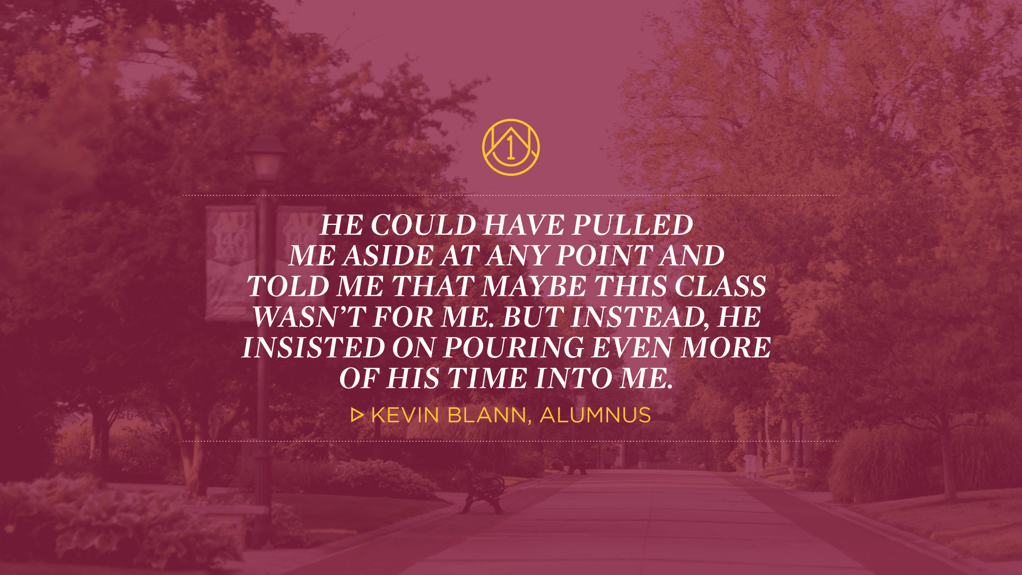 I started at Ashland as a pre-med student, but was really struggling with mathematics. Dr. Alan Poorman saw I was having trouble and took me under his wing. I came to Ashland as a remedial math student and left the college with differential equations. Throughout the entire process, this man would take me to his house, sit me down, and teach me various types of mathematics. It was really that simple. I ended up working at Battelle Memorial Institute in Columbus, Ohio doing high level applied science; I was a stock broker and portfolio manager for the Columbus office of Smith Barney; and now I’m with the Ohio Public Employees Retirement System. Much of my success has a direct correlation with Dr. Poorman keeping me after class and working with me on the weekends to ensure I learned what I needed. He could have pulled me aside at any point and told me the class wasn’t for me. But instead, he insisted on pouring even more of his time into me.